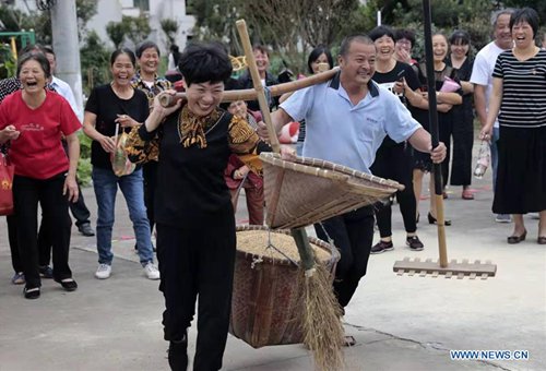 Villagers participate in a competition at Xuanjiaqiang Village of Zhuji City, east China's Zhejiang Province, Sept. 22, 2019. Farmers across the country celebrate the Chinese farmers' harvest festival, which falls on the Autumn Equinox, or Sept. 23 this year. (Photo: Guo Bin/Xinhua)