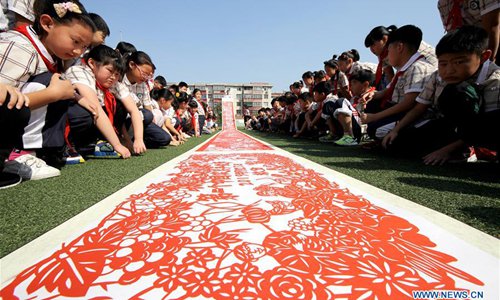 Pupils view a harvest themed paper cutting art work at Jianshelu primary school in Zaozhuang City, east China's Shandong Province, Sept. 23, 2019. Farmers across the country celebrate the Chinese farmers' harvest festival, which falls on the Autumn Equinox, or Sept. 23 this year. (Photo: Sun Zhongzhe/Xinhua)