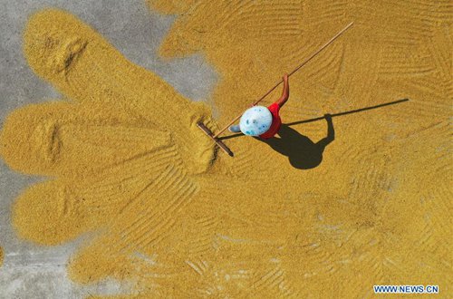 Aerial photo taken on Sept. 22, 2019 shows a villager drying rice at Guojiawan Village of Yayu Township in Yuping Dong Autonomous County of Tongren City, southwest China's Guizhou Province. Farmers across the country celebrate the Chinese farmers' harvest festival, which falls on the Autumn Equinox, or Sept. 23 this year. (Photo: Hu Panxue/Xinhua)