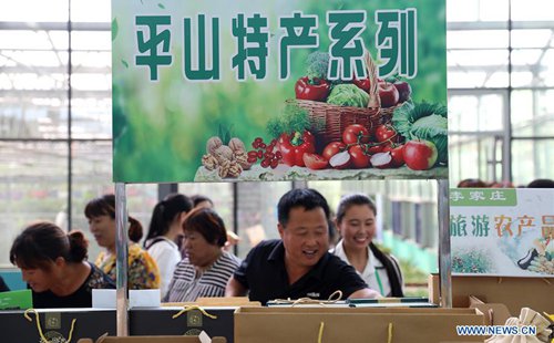 Visitors view agricultural products displayed in an event to celebrate the Chinese farmers' harvest festival at Lijiazhuang Village of Gangnan Town in Pingshan County of Shijiazhuang, north China's Hebei Province, Sept. 23, 2019. Farmers across the country celebrate the Chinese farmers' harvest festival, which falls on the Autumn Equinox, or Sept. 23 this year. (Photo: Liang Zidong/Xinhua)