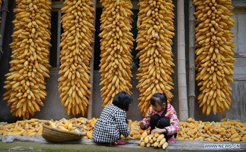 Children play near the newly harvested corns at Changping Village of Moudao Town in Lichuan City, central China's Hubei Province, Sept. 21, 2019. Farmers across the country celebrate the Chinese farmers' harvest festival, which falls on the Autumn Equinox, or Sept. 23 this year. (Photo: Yang Shunpi/Xinhua)