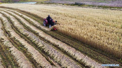 A farmer harvests crops at Mayinghai Village of Ningwu County, north China's Shanxi Province, Sept. 21, 2019. Farmers across the country celebrate the Chinese farmers' harvest festival, which falls on the Autumn Equinox, or Sept. 23 this year. (Photo: Cao Jianguo/Xinhua)