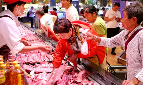 Customers shop for pork in a supermarket in Lianyungang, East China's Jiangsu Province. Photo: IC
