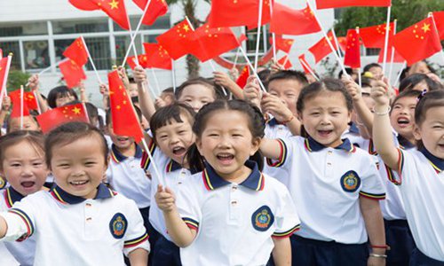 Children from a Kindergarten at Rugao county of Nantong city, East China's Jiangsu Province, wave national flag with joy, on September 20, 2019. Photo: VCG.