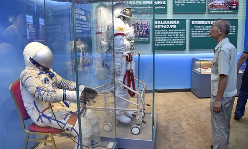 A visitor studies spacesuits on display Tuesday in Beijing at an exhibition of achievements for the 70th anniversary of the founding of the People's Republic of China. Photo: IC
