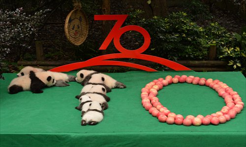 Employees at Chengdu Research Base of Giant Panda Breeding place seven newborns and dozens of apples in a "70" shape to mark the 70th anniversary of the founding of the People's Republic of China in Southwest China's Sichuan Province on Tuesday. Photo: IC