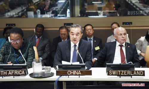 Chinese State Councilor and Foreign Minister Wang Yi addresses the commemoration of the 70th anniversary of the signing of the Geneva Conventions at the UN headquarters in New York, Sept. 23, 2019. (Photo: Xinhua)