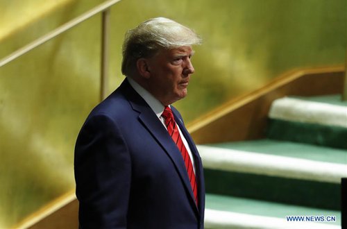 US President Donald Trump arrives to address the General Debate of the 74th session of the UN General Assembly at the UN headquarters in New York, on Sept. 24, 2019. The General Debate of the 74th session of the UN General Assembly opened on Tuesday with the theme of "Galvanizing multilateral efforts for poverty eradication, quality education, climate action and inclusion." (Photo: Xinhua)
