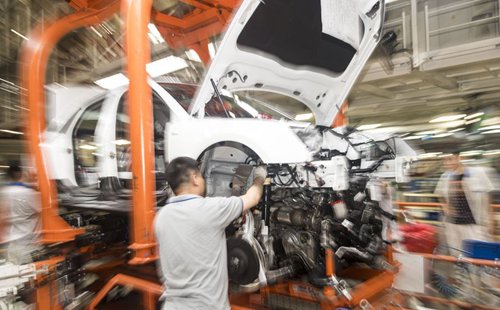 A worker assembles an Audi vehicle at FAW-Volkswagen factory in Changchun, northeast China's Jilin Province, July 9, 2019. (Photo: Xinhua)