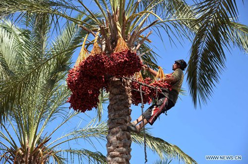 A Palestinian farmer harvests dates from a tree during the annual harvest season in Deir Al-Balah town, the central Gaza Strip, Sept. 24, 2019. (Photo: Rizek Abdeljawad/Xinhua)