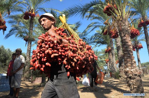 Palestinian farmers holds freshly picked dates during the annual harvest season in Deir Al-Balah town, the central Gaza Strip, Sept. 24, 2019. (Photo: Rizek Abdeljawad/Xinhua)