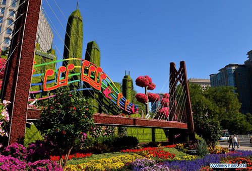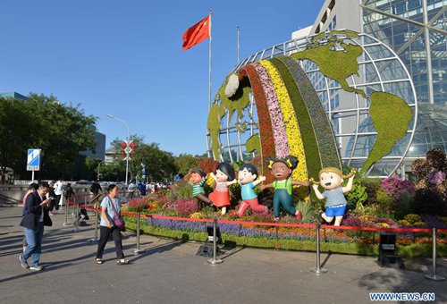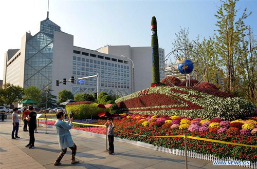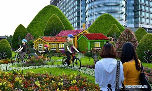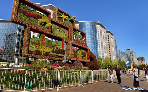 People look at a flowerbed titled "Beautiful Life" in downtown Beijing, capital of China, Sept. 23, 2019. Twelve flowerbeds were built along the Chang'an Avenue to celebrate the 70th anniversary of the founding of the People's Republic of China. (Photo: Xinhua)