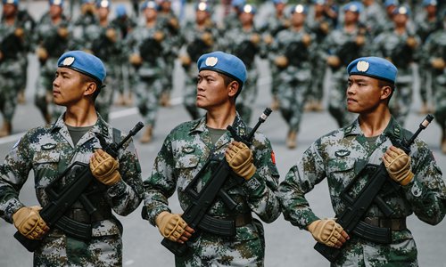 The phalanx of Chinese peacekeeping forces trains at the parade training center in Changping district, Beijing, on September 17. Photo: Li Hao/GT
