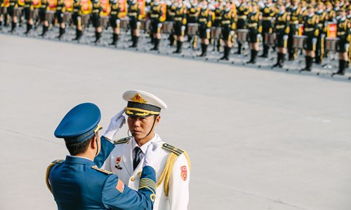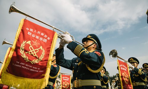 The Joint Military Band of the Chinese People's Liberation Army practices at the parade training center in Changping district, Beijing, on September 17. Photo: Li Hao/GT