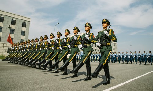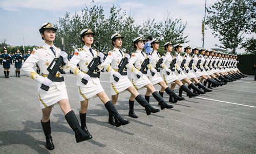 In preparation for the parade on October 1 to celebrate the 70th anniversary of the founding of the People's Republic of China, the phalanx of honor guards of army, navy and air force of the Chinese People's Liberation Army undergoes training at the parade training center in Changping district, Beijing, on September 17. Photo: Li Hao/GT