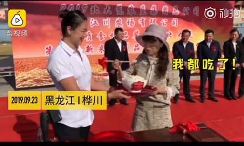 The woman successfully bought the first bowl of rice is enjoying her trophy. Photo: screenshot of video posted by Pear Video