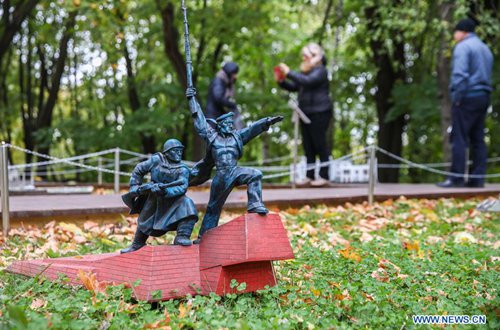A model of the Soldier and Sailor Monument is seen at the "Russia in Miniatures" exhibition in Moscow, Russia, on Sept. 25, 2019. More than 80 models of famous Russian landmarks are on display at the "Russia in Miniatures" exhibition in Moscow, which will run until October this year. (Photo: Maxim Chernavsky/Xinhua)