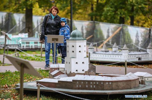 Visitors watch a model of Vyborg Castle at the "Russia in Miniatures" exhibition in Moscow, Russia, on Sept. 25, 2019. More than 80 models of famous Russian landmarks are on display at the "Russia in Miniatures" exhibition in Moscow, which will run until October this year. (Photo: Maxim Chernavsky/Xinhua)