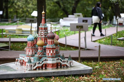A model of St. Basil's Cathedral is seen at the "Russia in Miniatures" exhibition in Moscow, Russia, on Sept. 25, 2019. More than 80 models of famous Russian landmarks are on display at the "Russia in Miniatures" exhibition in Moscow, which will run until October this year. (Photo: Maxim Chernavsky/Xinhua)