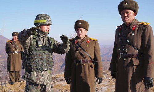This handout photo taken on December 12, 2018 and provided by South Korean Defence Ministry shows a South Korean officer (left) speaking with North Korean officers (right) during an inspection of the dismantled North Korean guard post inside the Demilitarized Zone dividing the two Koreas in Cheorwon. Soldiers from North and South Korea crossed into each other's territory peacefully for the first time on Wednesday, Seoul said. Photo: AFP