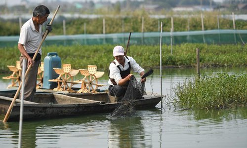 Crab breeders harvest crabs at a breeding base in Wuxing District of Huzhou, east China's Zhejiang Province, Sept. 26, 2019. Local farmers were busy with their work in harvest season of the Taihu Lake crab. (Xinhua/Huang Zongzhi)