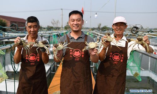 Crab breeders display crabs at a breeding base in Wuxing District of Huzhou, east China's Zhejiang Province, Sept. 26, 2019. Local farmers were busy with their work in harvest season of the Taihu Lake crab. (Xinhua/Huang Zongzhi)