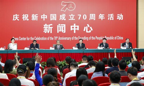 China's Minister of Education Chen Baosheng, Minister of Civil Affairs Huang Shuxian, Minister of Human Resources and Social Security Zhang Jinan, Minister of Housing and Urban-Rural Development Wang Menghui and Head of China's National Health Commission Ma Xiaowei attend a press conference on China's efforts to meet people's aspirations for a better life and to ensure and improve their livelihoods through development in Beijing, capital of China, Sept. 26, 2019. The press center for the celebration of the 70th anniversary of the founding of the People's Republic of China held its second press conference here on Thursday. (Xinhua/Shen Bohan)