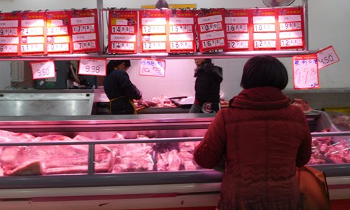 A consumer buys pork at a local market in Yunyang, Southwest China’s Chongqing in February. Photo: IC
