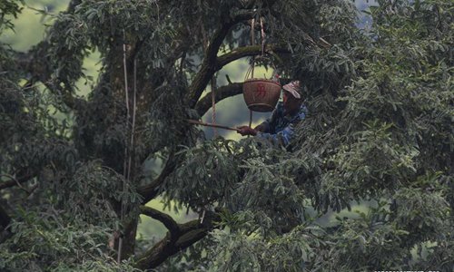 A villager picks the Chinese torreya nuts in Longxi Village of Jidong Township in Shaoxing, east China's Zhejiang Province, Sept. 27, 2019. Jidong Township is a major production area of the Chinese torreya nuts with the total output reaching over 450 tons each year. (Xinhua/Huang Zongzhi)
