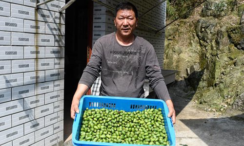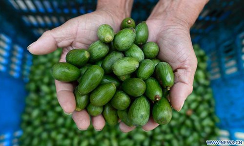 A villager displays the Chinese torreya nuts picked in Longxi Village of Jidong Township in Shaoxing, east China's Zhejiang Province, Sept. 27, 2019. Jidong Township is a major production area of the Chinese torreya nuts with the total output reaching over 450 tons each year. (Xinhua/Huang Zongzhi)