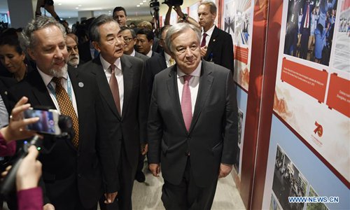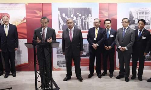 Chinese State Councilor and Foreign Minister Wang Yi (C, front) and United Nations (UN) Secretary-General Antonio Guterres (R, front) visit a photo exhibition on China's achievements in the past 70 years at the UN headquarters in New York, Sept. 26, 2019. Wang attended the opening ceremony of the photo exhibition on Thursday. (Xinhua/Liu Jie)