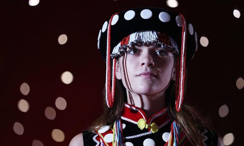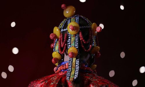 A model presents costumes of Chinese ethnic groups during a gala celebrating the 70th anniversary of the founding of the People's Republic of China (PRC) staged at a cruise ship on the Seine River in Paris, France, Sept. 27, 2019. (Xinhua/Gao Jing)