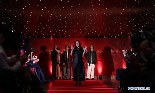 Designer Liang Zi (C) greets the audience during a gala celebrating the 70th anniversary of the founding of the People's Republic of China (PRC) staged at a cruise ship on the Seine River in Paris, France, Sept. 27, 2019. (Xinhua/Gao Jing)