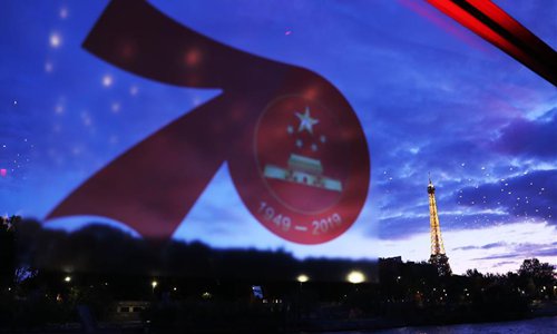 Photo taken on Sept. 27, 2019 shows a logo marking the 70th anniversary of the founding of the People's Republic of China (PRC) during a gala staged at a cruise ship on the Seine River in Paris, France, Sept. 27, 2019. (Xinhua/Gao Jing)