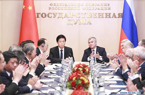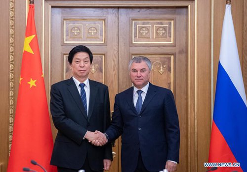 During his talks with the heads of Russian parliament, Li said the cooperation between legislative bodies, as an important part of the China-Russia comprehensive strategic partnership of coordination for a new era, is expected to prioritize the implementation of the consensus reached by the two heads of state.