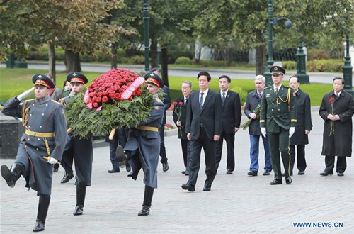 Li Zhanshu, chairman of the Standing Committee of the National People's Congress of China, presents a wreath to the Tomb of the Unknown Soldier in Moscow, Russia, Sept. 26, 2019. Li paid an official goodwill visit to Russia from Sept. 25 to 28. (Photo: Xinhua)