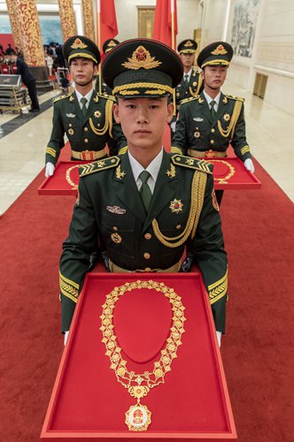 President Xi Jinping presented national medals and honorary titles of the People's Republic of China (PRC) to awardees in the Great Hall of the People on Sunday morning, ahead of the country's grand celebrations for the 70th anniversary of the founding of the PRC, scheduled for Tuesday.