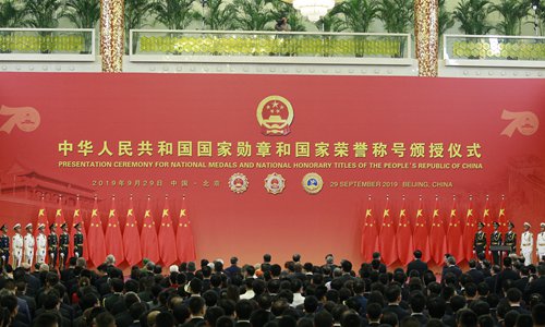 China held the award ceremony at the Great Hall of the People on Sunday morning to award national medals to 42 awardees including Chinese and foreigners. Photo: VCG