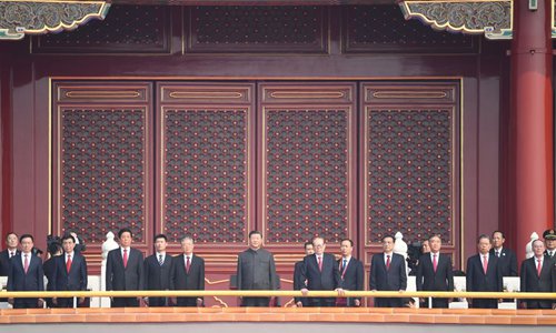 Atop the newly furnished rostrum, Xi was joined by incumbent and retired senior leaders including Li Keqiang, Li Zhanshu, Wang Yang, Wang Huning, Zhao Leji, Han Zheng, Wang Qishan, Jiang Zemin and Hu Jintao.