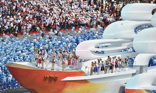 A float formation takes part in a mass pageantry celebrating the 70th anniversary of the founding of the People's Republic of China (PRC) in Beijing, capital of China, Oct. 1, 2019. (Xinhua/Wang Jianwei)
