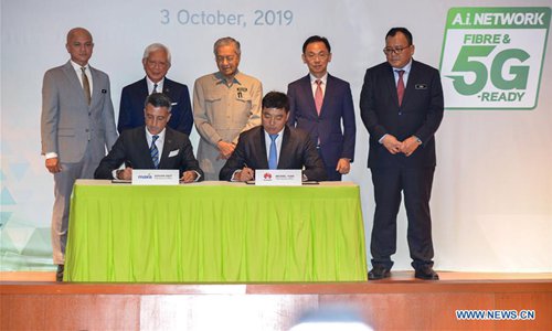 Malaysian Prime Minister Mahathir Mohamad (C back), witnesses the signing of a provisioning agreement by Yuan Ming (R front), head of Huawei Malaysia, and Gokhan Ogut (L front), Chief Executive Officer of Maxis, a leading converged communications and digital services company in Malaysia, in Putrajaya, Malaysia, Oct. 3, 2019. Chinese tech giant Huawei's entry into Malaysia will help boost Malaysia's adoption of 5G technology with the signing of a provisioning agreement on Thursday. (Photo by Chong Voon Chung/Xinhua)