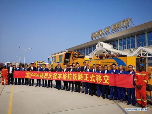 Photo taken on Oct. 3, 2019 shows a large maintenance machine at the Lobito station of the Benguela Railway in Lobito, Angola. The Benguela Railway, which was built by the China Railway 20 Bureau Group Corporation (CR20), was officially handed over to Angola in the port city of Lobito on Thursday. The 1,344-km railway runs through Angola, from west of the Atlantic port city of Lobito, eastward through important cities such as Benguela, Huambo, Kuito and Luena, and reaches the border city of Luao, bordering the Democratic Republic of the Congo. (Photo by Liu Zhi/Xinhua)