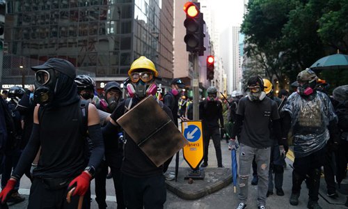 Masked rioters obstruct road traffic at Queen's Road East in Hong Kong, south China, Sept. 15, 2019. Photo:Xinhua