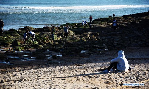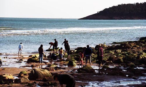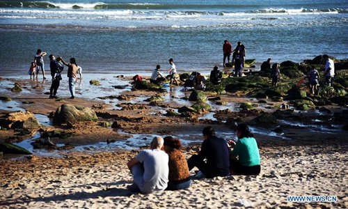 People enjoy their time at a beach in Laoshan District of Qingdao, east China's Shandong Province, Oct. 5, 2019. Many tourists and local residents spend their leisure time at the beach of Qingdao during the National Day holiday. (Xinhua)