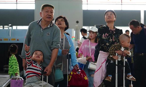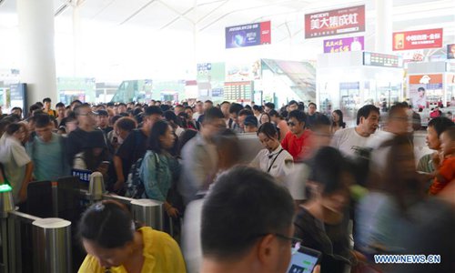 Passengers walk to exit the Guiyang Railway Station in Guiyang, capital of southwest China's Guizhou Province, Oct. 6, 2019. As the seven-day National Day holiday draws to an end, railway stations across the country witnessed a travel rush on Oct. 6. (Xinhua/Tao Liang)