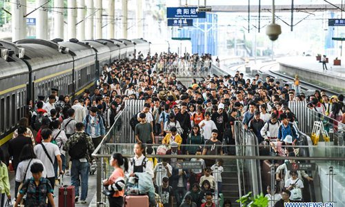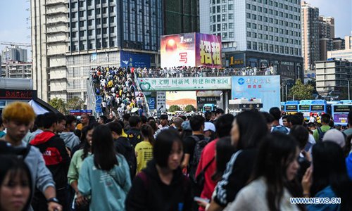 Passengers crowd the square of Guiyang Railway Station in Guiyang, capital of southwest China's Guizhou Province, Oct. 6, 2019. As the seven-day National Day holiday draws to an end, railway stations across the country witnessed a travel rush on Oct. 6. (Xinhua/Tao Liang)