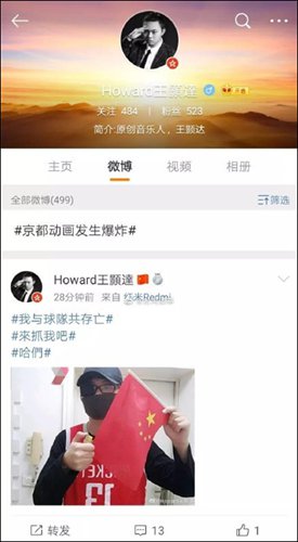 Screen captures by People's Daily on Weibo showed that Wang posted a photo of himself holding a Chinese national flag and lighter, saying, "I live and die with the team" and "Come and catch me."