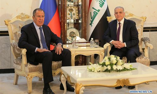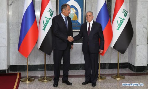 Iraqi Foreign Minister Mohammed al-Hakim (R) meets with Russian Foreign Minister Sergey Lavrov in Baghdad, Iraq, on Oct. 7, 2019. Mohammed al-Hakim and his Russian counterpart Sergey Lavrov on Monday called here for increasing efforts to reduce tensions in the Gulf region and the return of Syria to the Arab League (AL). (Xinhua/Khalil Dawood)