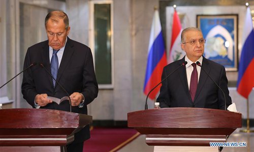 Iraqi Foreign Minister Mohammed al-Hakim (R) and Russian Foreign Minister Sergey Lavrov attend a joint press conference in Baghdad, Iraq, on Oct. 7, 2019. Mohammed al-Hakim and his Russian counterpart Sergey Lavrov on Monday called here for increasing efforts to reduce tensions in the Gulf region and the return of Syria to the Arab League (AL). (Xinhua/Khalil Dawood)