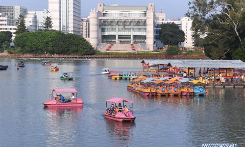 Tourists enjoy leisure time by boat at Xihu Park in Fuzhou, southeast China's Fujian Province, Oct. 7, 2019. According to the Ministry of Culture and Tourism (MCT), Chinese tourists made 782 million visits to recreational and cultural activities during the week-long National Day holiday, marking a year-on-year increase of 7.81 percent. China's tourism industry has raked in over 649.71 billion yuan (about 90.9 billion U.S. dollars) in revenue from domestic tourists during the holiday, up 8.47 percent from a year earlier. (Xinhua/Lin Shanchuan)